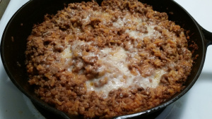 Brown ground beef in skillet with lid (iron skillet works well but is not essential). While beef is browning, put onion flakes in small bowl and add about 1/4 cup hot water to rehydrate. When beef is done, stir in onions, garlic, and seasonings, then dry rice. Add tomato sauce and half the cheese, then sprinkle remaining cheese on top. Place lid on skillet and bake at 300 for 30 minutes.