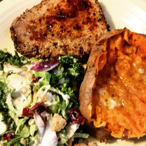 Friday steak night with sweet potato and a kale salad. via Instagram http://ift.tt/1TC1A6X