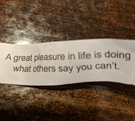 Images From A Fortune Cookie January 17, 2019 Tony Burgess 2 Comments A great pleasure in life is doing what others say you can’t. Ok then. Share this: Click to share on Facebook (Opens in new window) Facebook Click to share on Threads (Opens in new window) Threads Click to share on Bluesky (Opens in new window) Bluesky More Click to share on Tumblr (Opens in new window) Tumblr Click to email a link to a friend (Opens in new window) Email Click to print (Opens in new window) Print Click to share on Pinterest (Opens in new window) Pinterest Like Loading... Related
