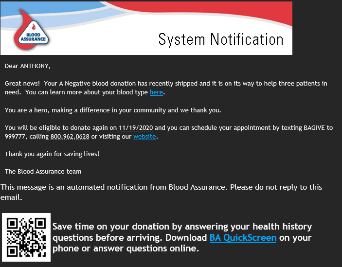 I love it when I get this email from the blood bank where I work that my donation is on the way to help someone. It is indeed a good feeling knowing that a life might be saved with this gift of life.