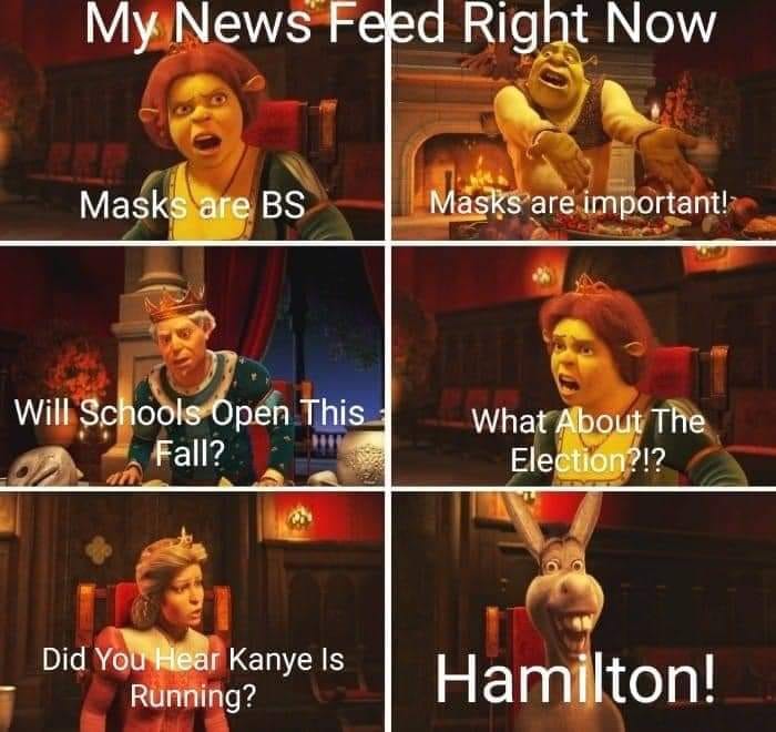 This Shrek themed meme has all sorts of truth in it. Masks, schools, elections and Hamilton are the leading topics of conversation and news in many of our social feeds. I know many folks who have logged off because of the chaos and negativity. There is a balance somewhere between being informed and preserving sanity.