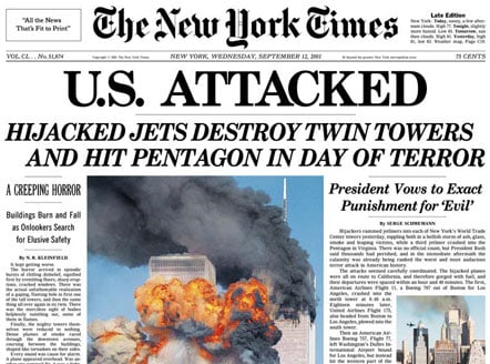 This is what the New York Times looked like the day after 9/11. This historic event must never be forgotten. It was one of history’s worst events and one of humanity’s shining moments in how people came together for a time in the aftermath. This event seems so long ago. Always remember this day. It’s important to do so. Let there be peace on Earth.