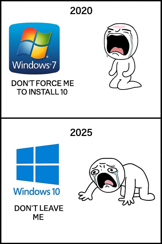 I found this meme on Facebook that shows the lament of people who really liked Windows 7 and didn’t want to upgrade to Windows 10. Those same people now don’t want Windows 10 to go away. I like Windows 10, but I think my Linux Mint 22.2 Dell desktop works just fine for my needs. A lot of older hardware will fall by the wayside because of Windows 11’s heavy resource and technology demands.